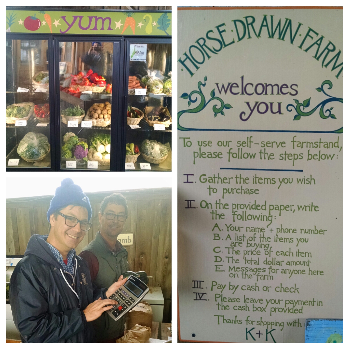 I didn’t get a chance to speak to the owners, Kathryn Thomas and Ken. That’s because the Horse Drawn Farm’s products for sale – frozen meat and all kinds of vegetables – are sold via the self-serve honor system. With nobody to ring you up, you simply calculate the total cost of a purchase using the scale and calculator, and leave cash or a check on the counter.