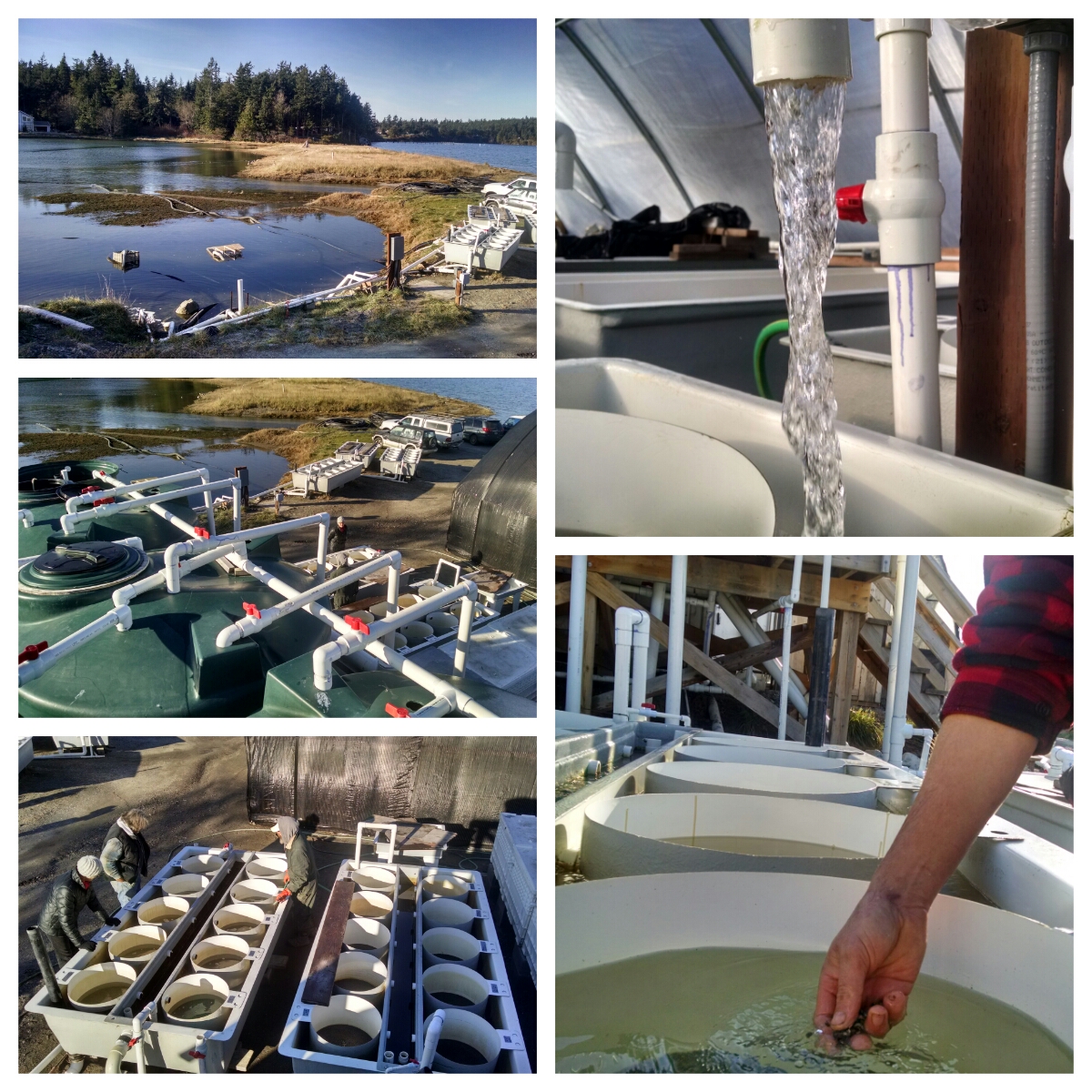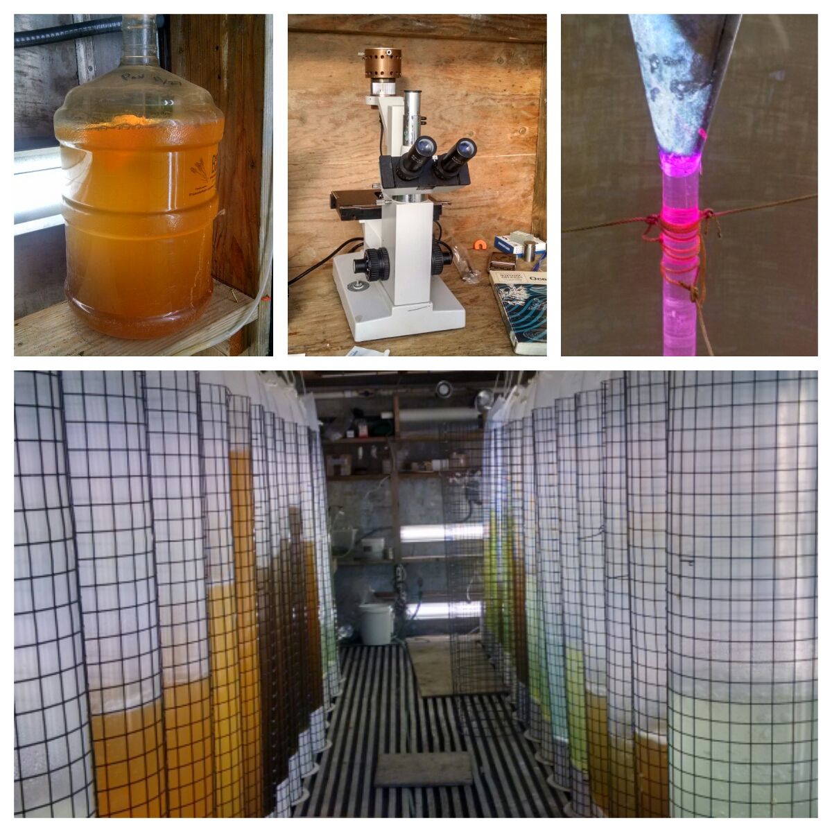 These days, the mention of science and farming in the same breath immediately brings to mind the hotly debated issue of GMOs (against which, by the way, San Juan County recently scored a victory). But that’s not necessarily what comes to mind for Nick and Sara Jones of Jones Family Farms. Step inside one of the buildings on Jones’ Sweetwater shellfish farm on Shoal Bay, and you’ll understand why. Alongside the tubs holding millions of baby oysters and clams is an array of objects you’d associate more with a mad scientist than you would a shellfish farmer: beakers, pipettes, microscopes, tubes with fluorescent lights running through them, and – my favorite – human-sized bags full of green liquid. It’s a scene right out of a science fiction movie. But this isn’t somebody’s little science experiment. This is home of the largest supplier of clam and oyster seed to independent shellfish farms in the region, and producer of some of the highest quality shellfish for Seattle, one of the most discriminating restaurant markets in the world.